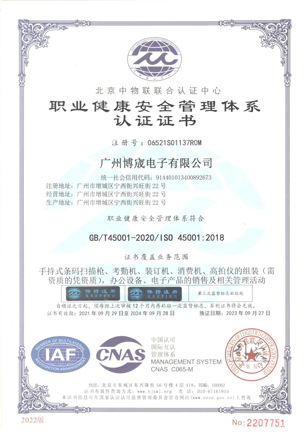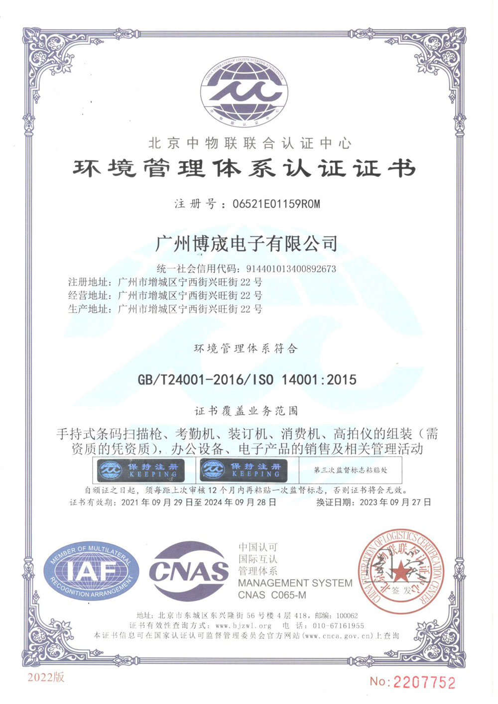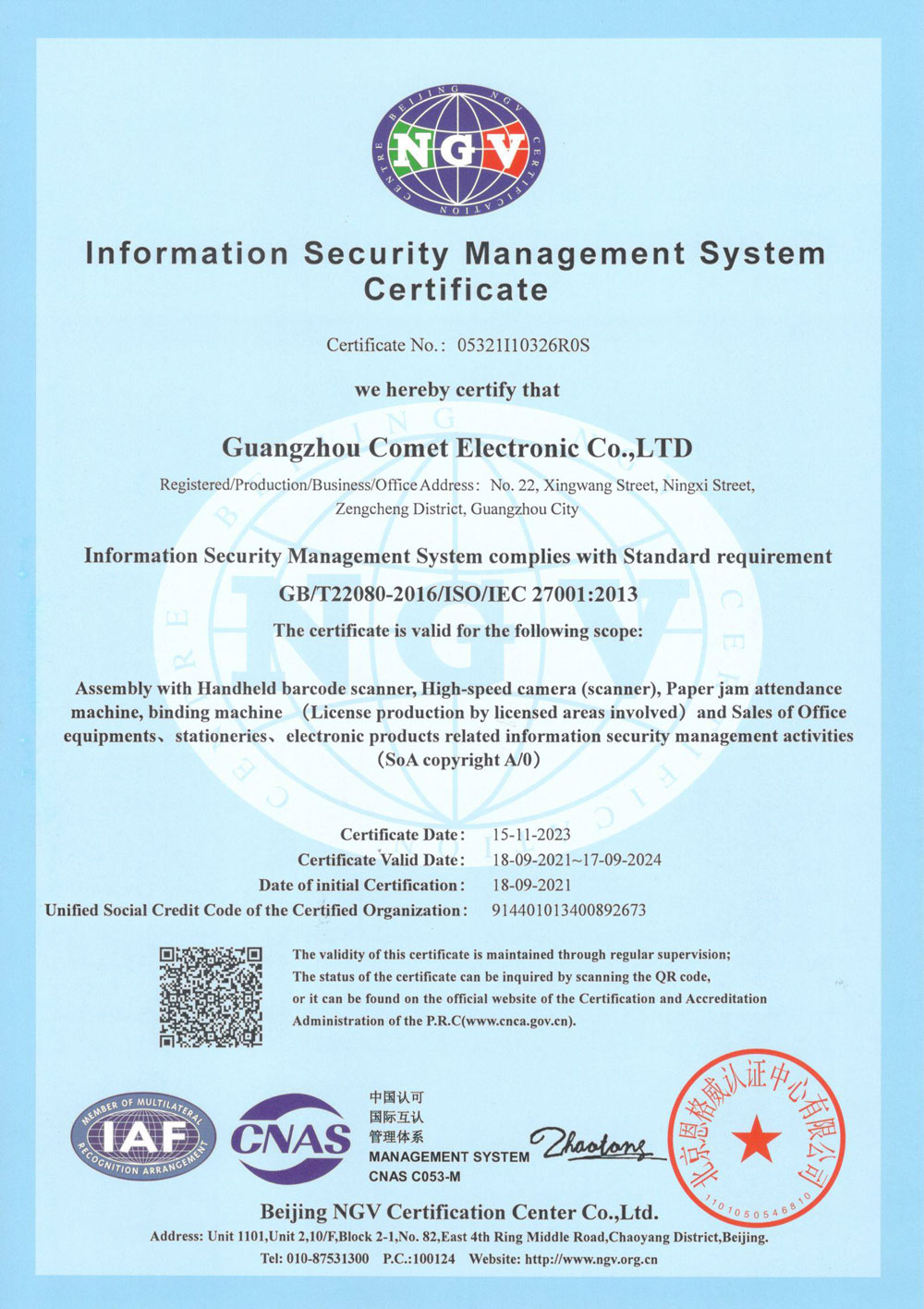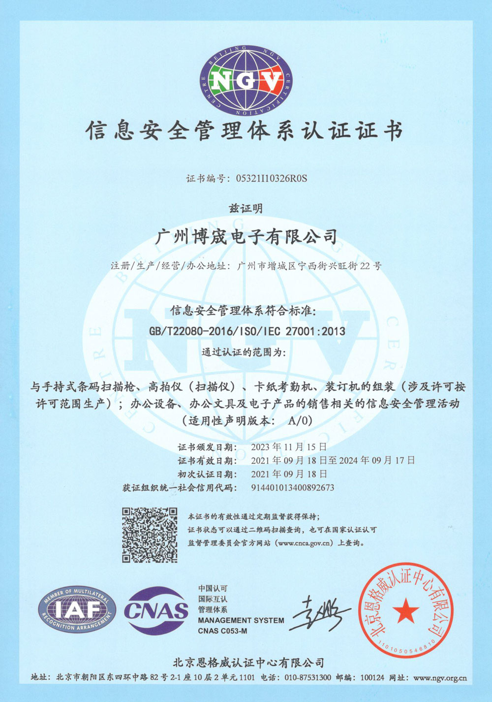 信息安全管理体系认证证书