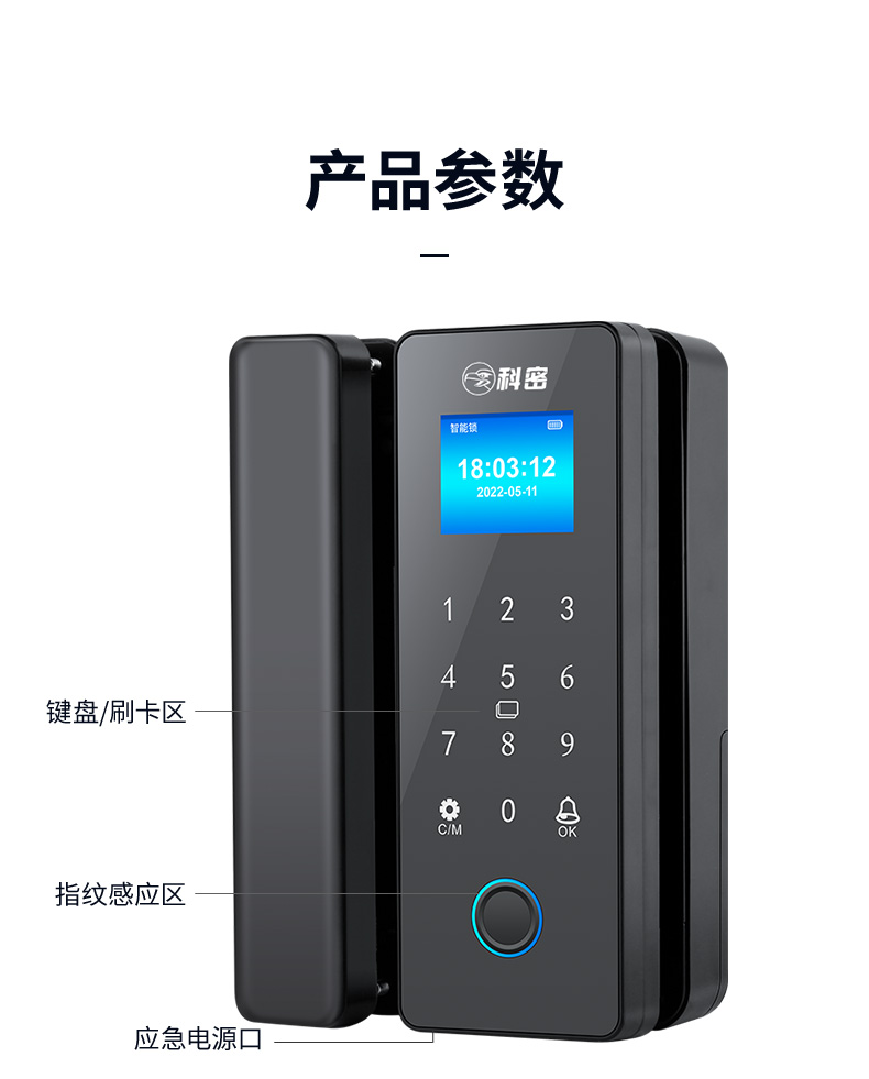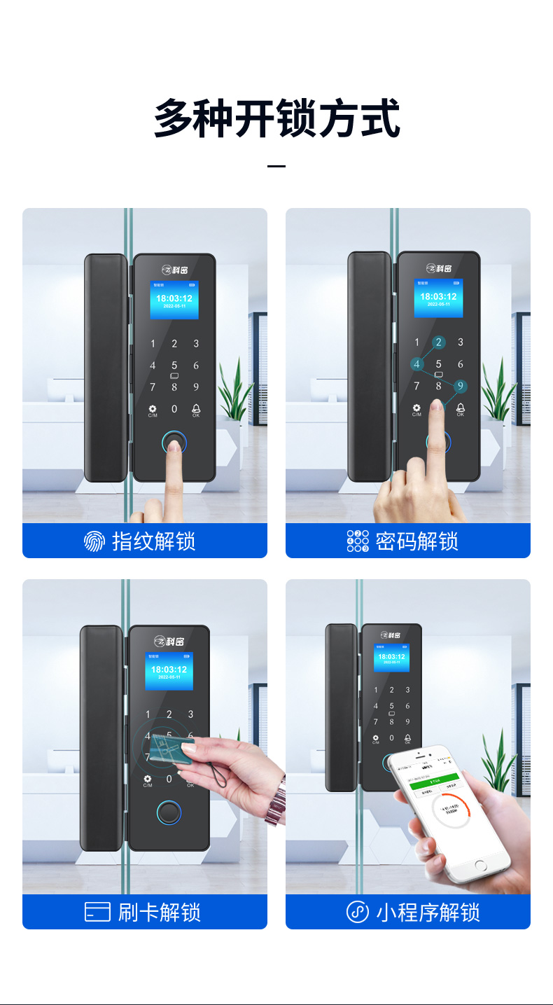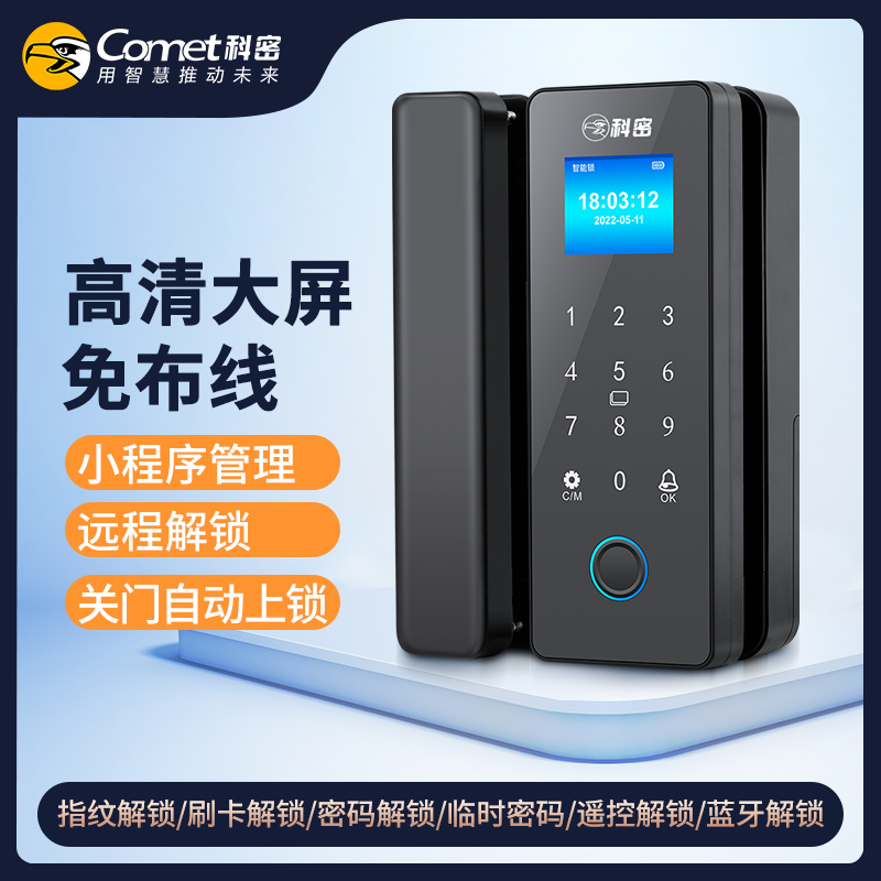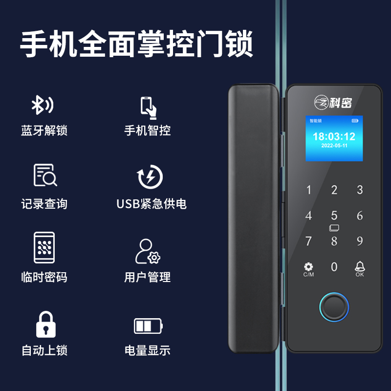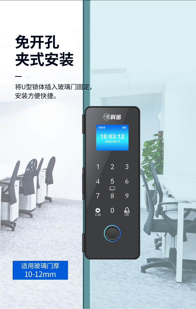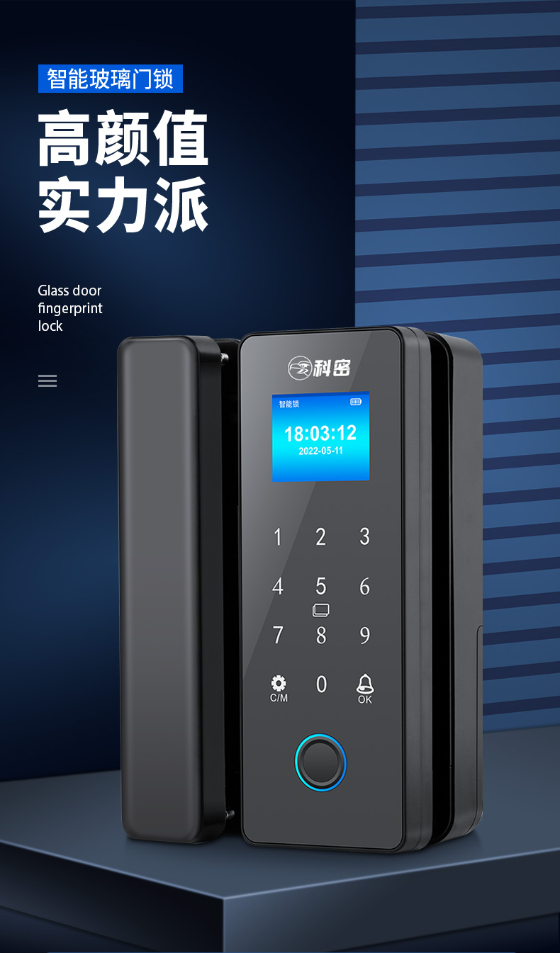科密玻璃门锁商铺双开门免开孔办公室锁有框单开智能单门密码指纹