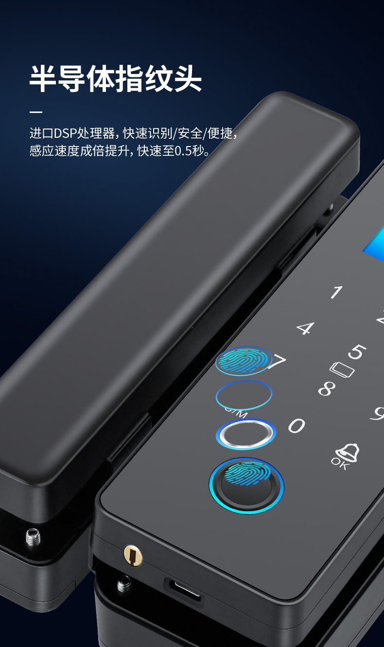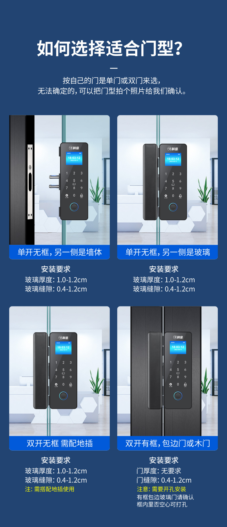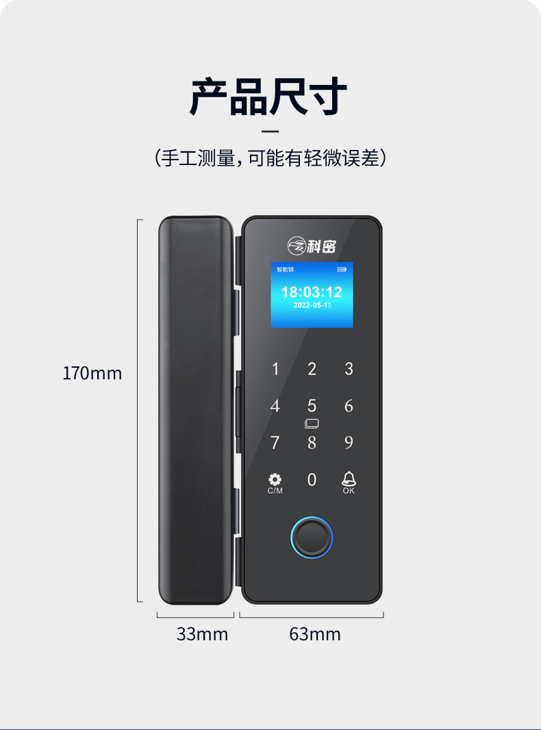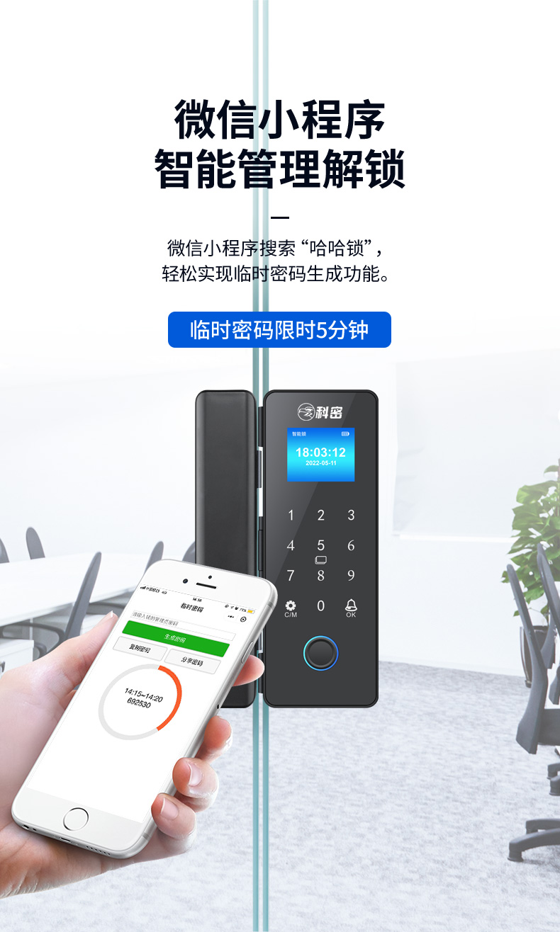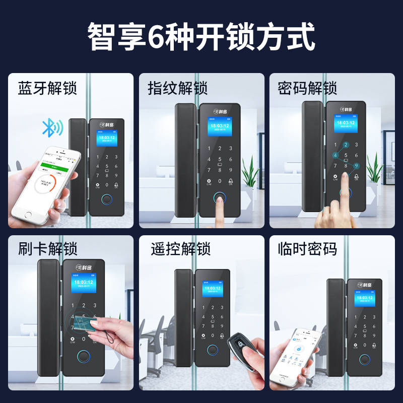 科密玻璃门锁商铺双开门免开孔办公室锁有框单开智能单门密码指纹