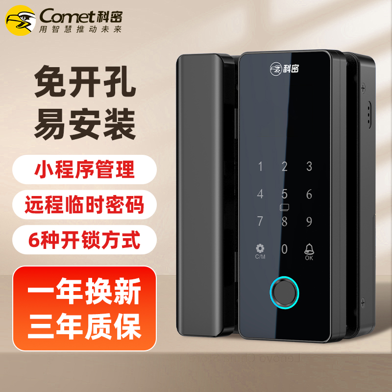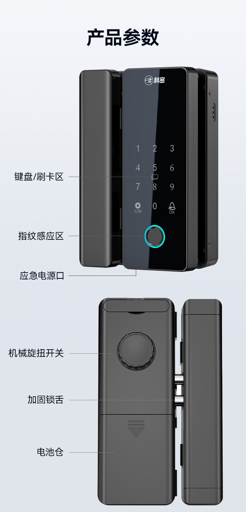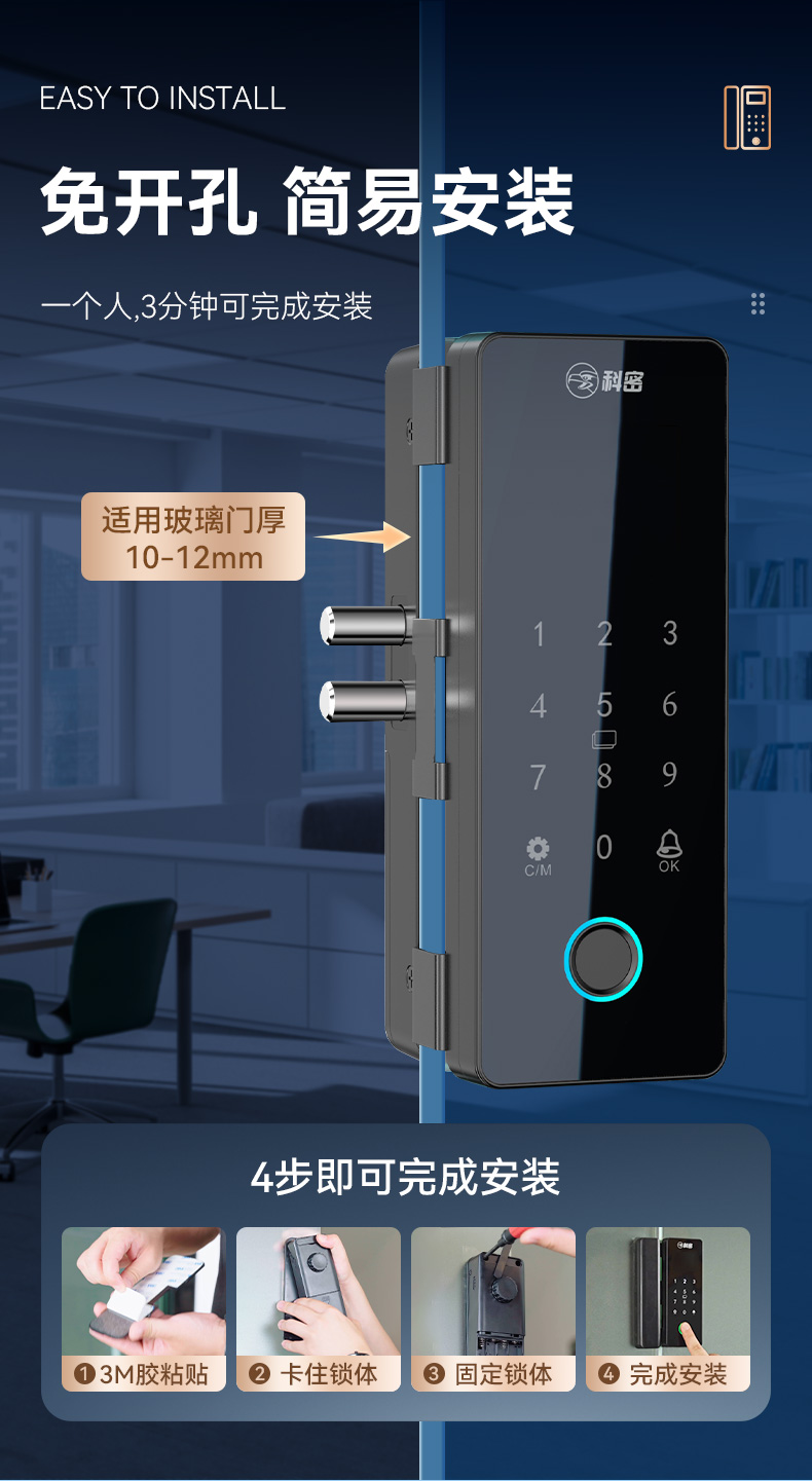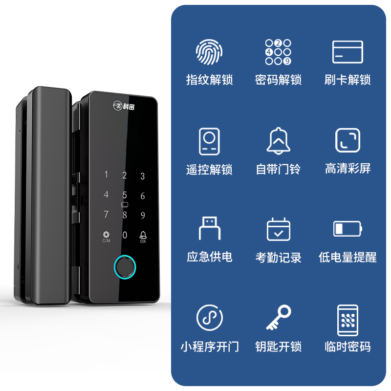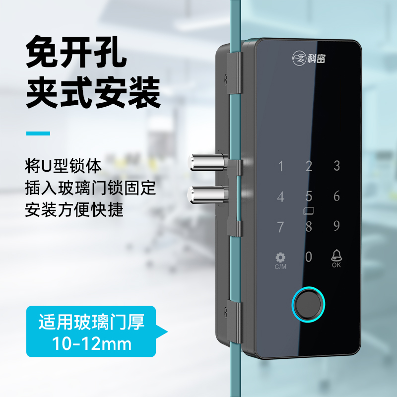 科密TOM-170玻璃门密码锁有框无框单双开门办公室免开孔智能电子指纹门锁