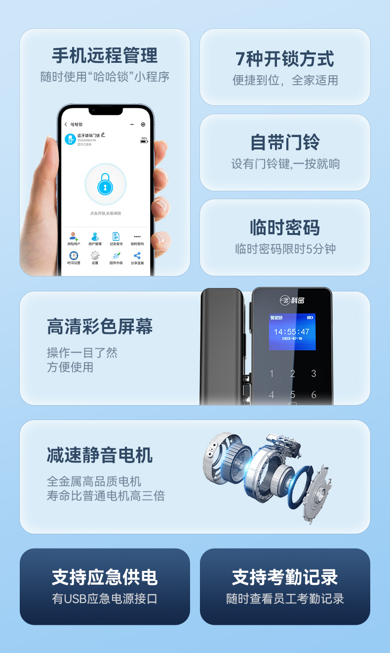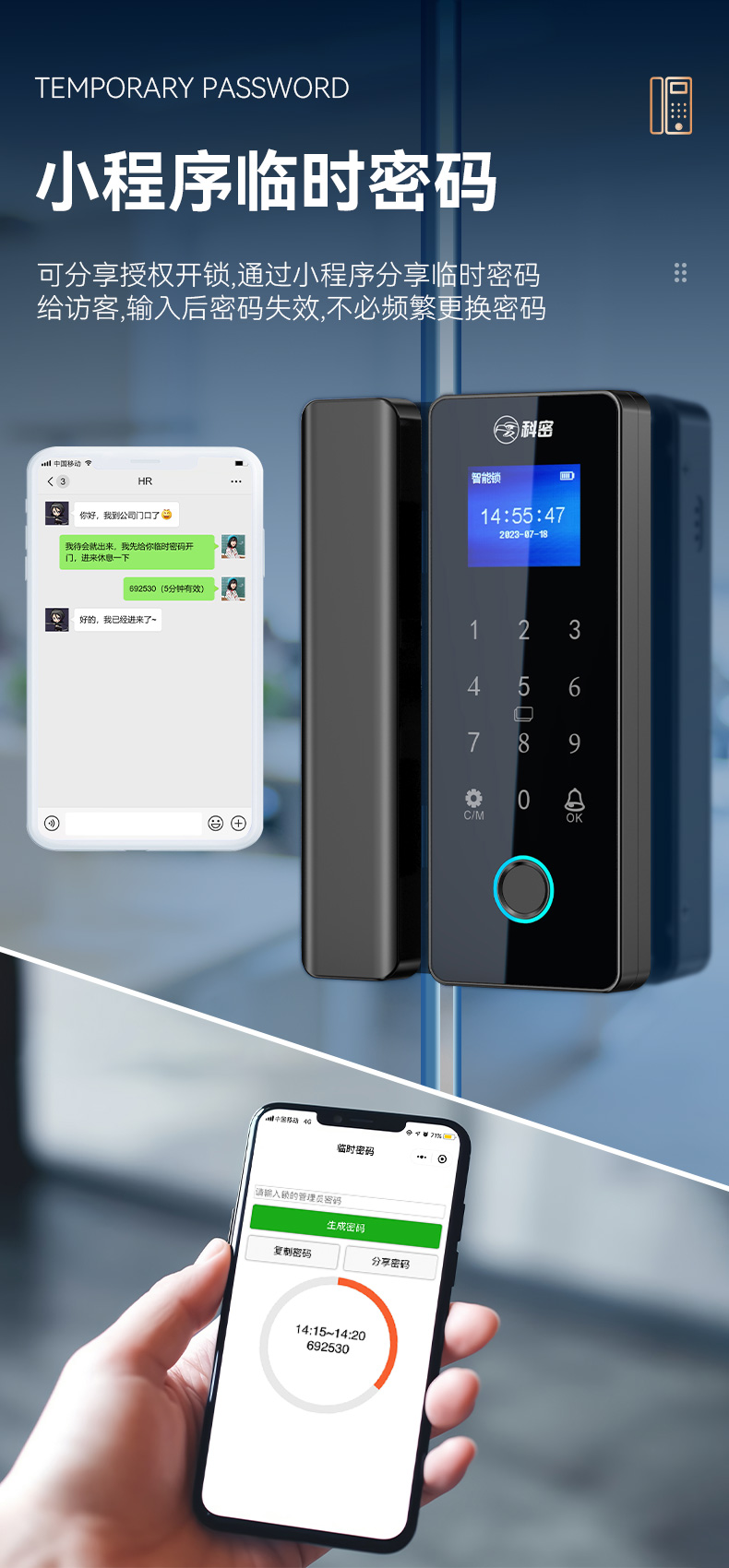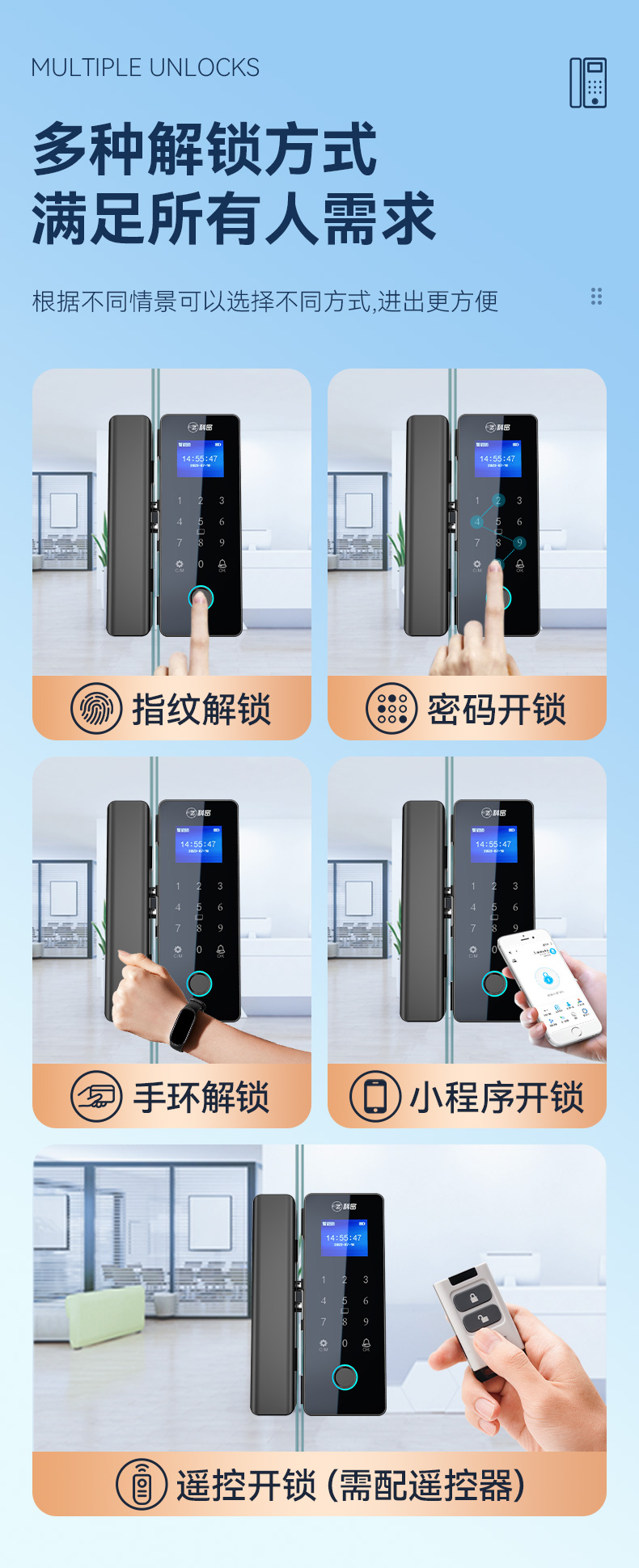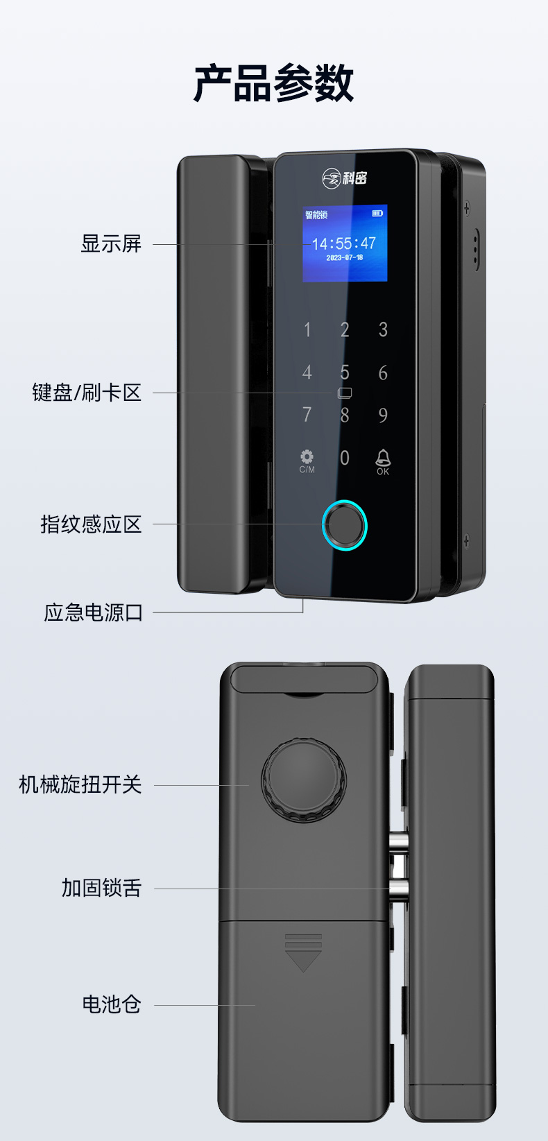 科密TOM-171玻璃门密码锁有框无框单双开门办公室免开孔智能电子指纹门锁