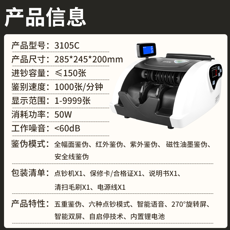 科密(comet) 验钞点钞机支持新版人民币 可充电便携收银家用商用 智能语音小型验钞数钞机3105C